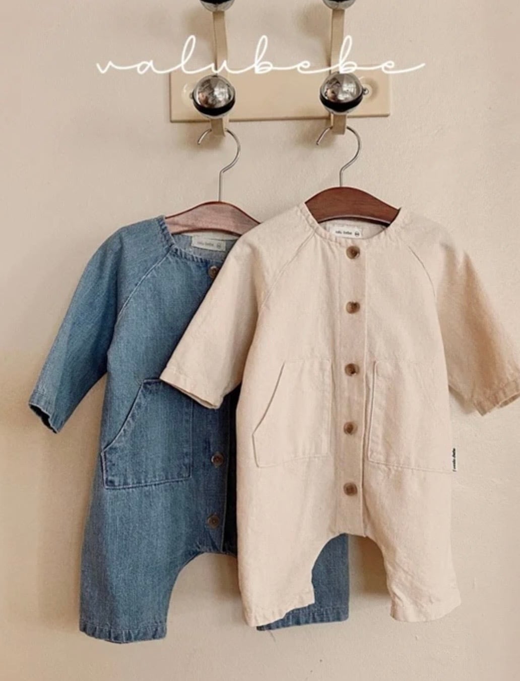 ナチュラルな風合いと、くすみカラーが魅力のロンパース。